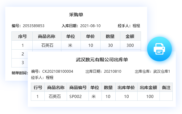 支持靈活配置,預置采購單、訂單、出庫單等單據模板,一鍵打印