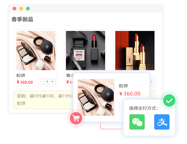 內設商品字段,商家可以輕易搭建在線商城,支持微信/支付寶收款渠道,商家線上營銷更便捷
