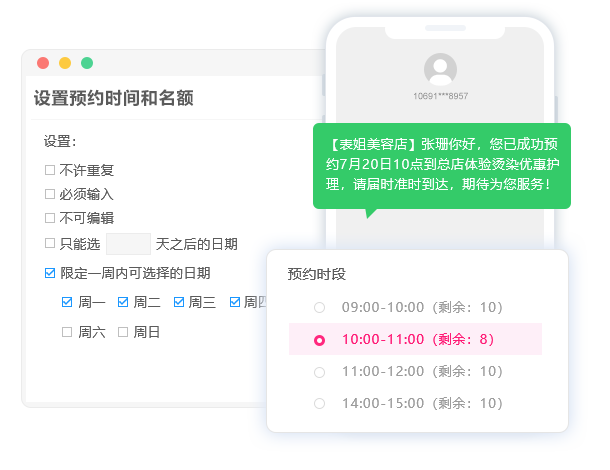 支持限時/限額/限量的特殊預約場景,可按天或時段自定義設置預約名額,方便商家把控客戶人數,合理排期