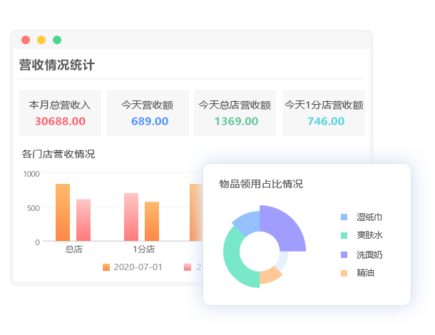 每日營收在線上報,系統自動生成實時報表,可統一查看各門店、各銷售人員、各類產品銷售情況,為店鋪經營提供數據支持